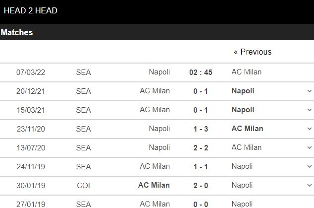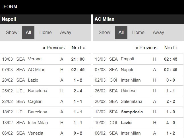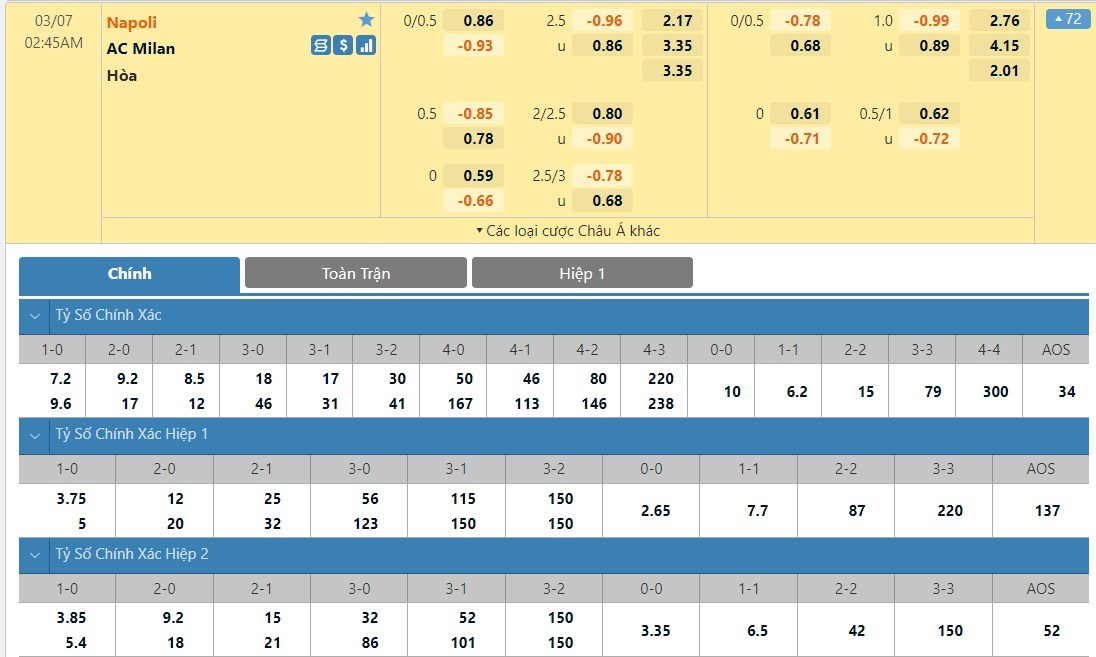 Xem tỷ lệ kèo cá cược bóng đá trực tuyến Napoli vs AC Milan