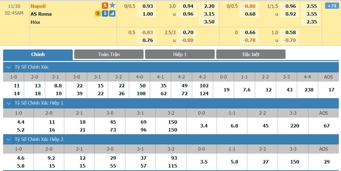 Tỷ lệ kèo cá cược bóng đá trực tuyến trận Napoli vs AS Roma