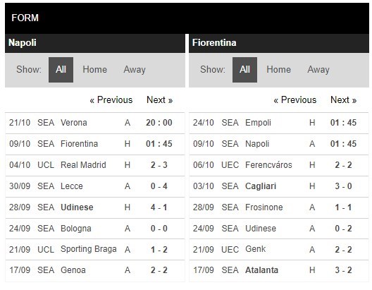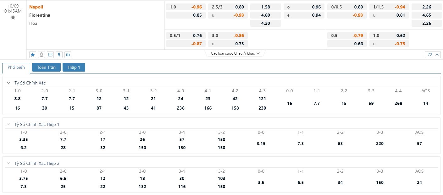 Xem tỷ lệ kèo cá cược bóng đá trực tuyến Napoli vs Fiorentina
