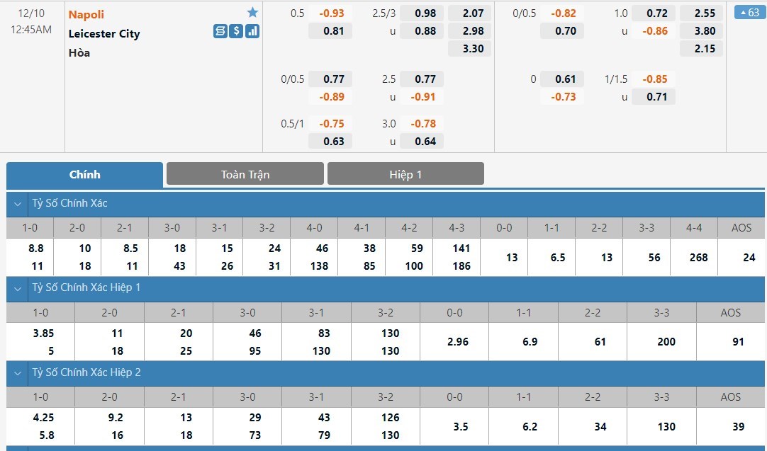 Tỷ lệ kèo cá cược bóng đá trực tuyến trận Napoli vs Leicester City