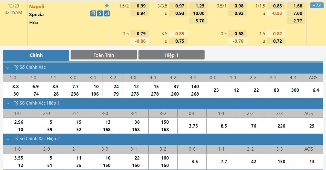 Tỷ lệ kèo cá cược bóng đá trực tuyến trận Napoli vs Spezia