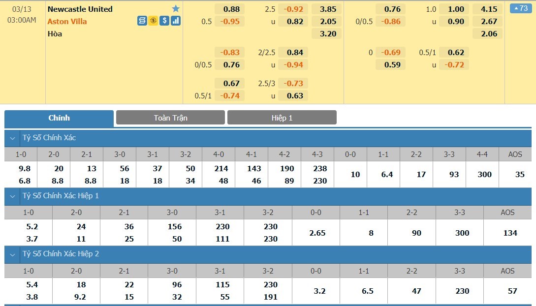 Xem tỷ lệ kèo cá cược bóng đá trực tuyến Newcastle United vs Aston Villa