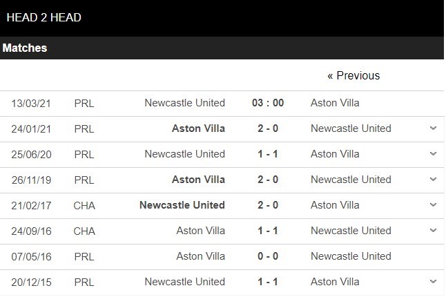 Thống kê đối đầu Newcastle United vs Aston Villa