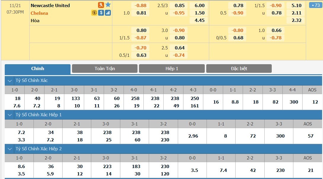 Xem tỷ lệ kèo cá cược bóng đá trực tuyến Newcastle United vs Chelsea