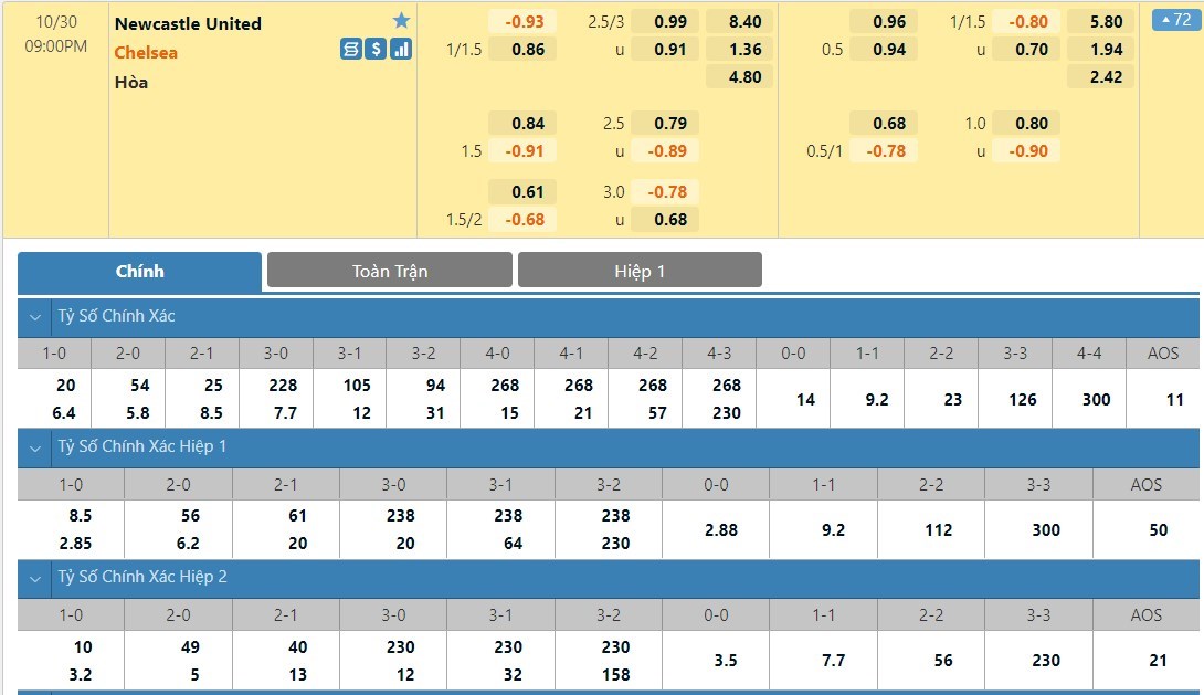 Tỷ lệ kèo cá cược bóng đá trực tuyến trận Newcastle United vs Chelsea