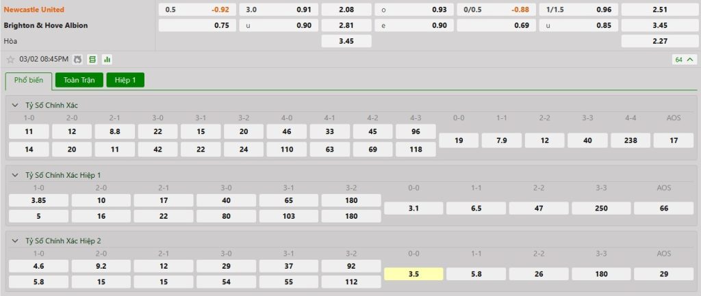 Tỷ lệ kèo cá cược bóng đá trực tuyến trận Newcastle vs Brighton
