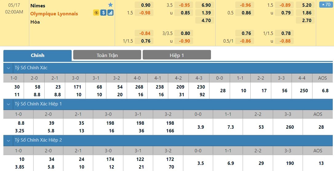 Tỷ lệ kèo cá cược bóng đá trực tuyến trận Nimes vs Lyon