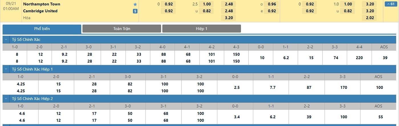 Tỷ lệ kèo cá cược bóng đá trận Northampton Town vs Cambridge United