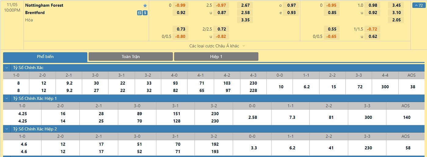 Tỷ lệ kèo cá cược bóng đá trực tuyến trận Nottingham vs Brentford