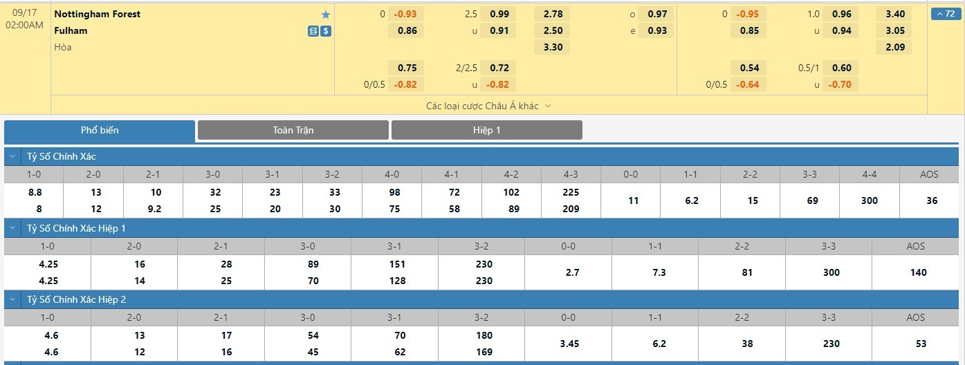 Xem tỷ lệ kèo cá cược bóng đá trực tuyến Nottingham vs Fulham