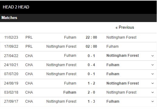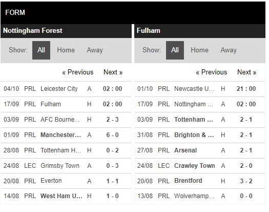 Thống kê đối đầu Nottingham vs Fulham