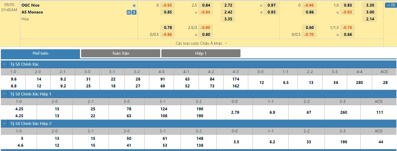 Tỷ lệ kèo cá cược bóng đá trận OGC Nice vs AS Monaco