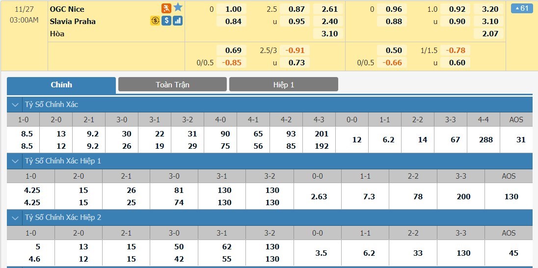 Tỷ lệ kèo cá cược bóng đá trực tuyến trận OGC Nice vs Slavia Praha