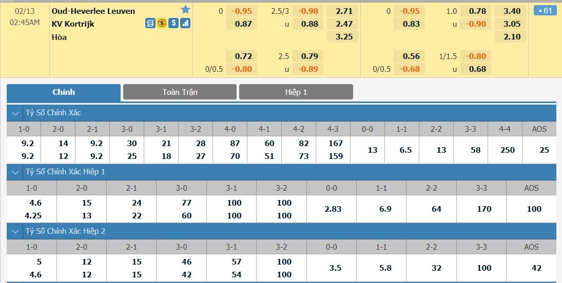 Tỷ lệ kèo cá cược bóng đá trận OH Leuven vs Kortrijk