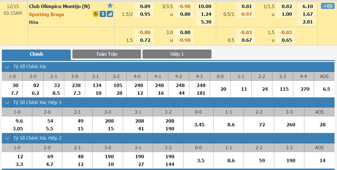 Tỷ lệ kèo cá cược bóng đá trận Olimpico Montijo vs Braga
