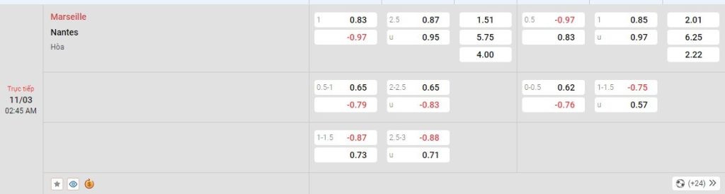 Tỷ lệ kèo cá cược bóng đá trực tuyến trận Olympique de Marseille vs Nantes