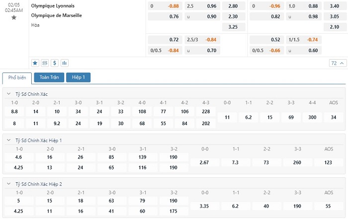Xem tỷ lệ kèo cá cược bóng đá trực tuyến Olympique Lyonnais vs Marseille
