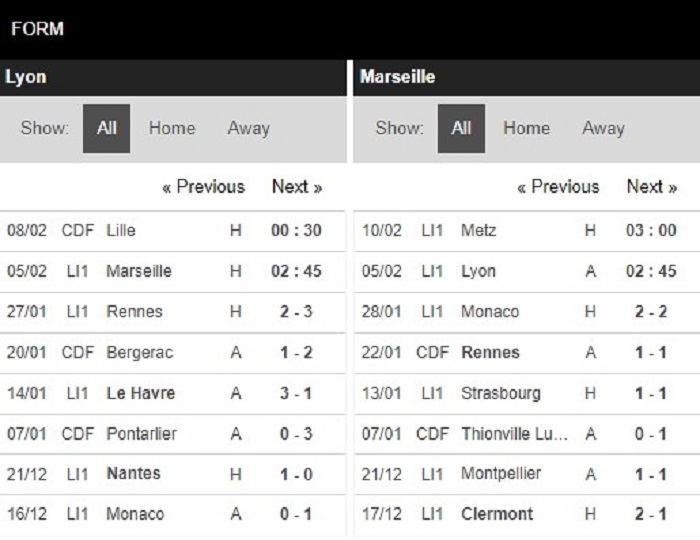 Thống kê phong độ Olympique Lyonnais vs Marseille