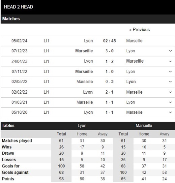 Thống kê đối đầu Olympique Lyonnais vs Marseille