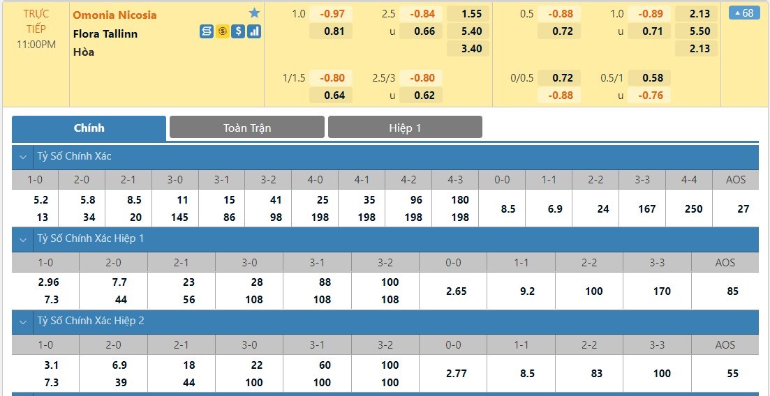 Tỷ lệ kèo cá cược bóng đá trực tuyến trận Omonia Nicosia vs Flora Tallinn