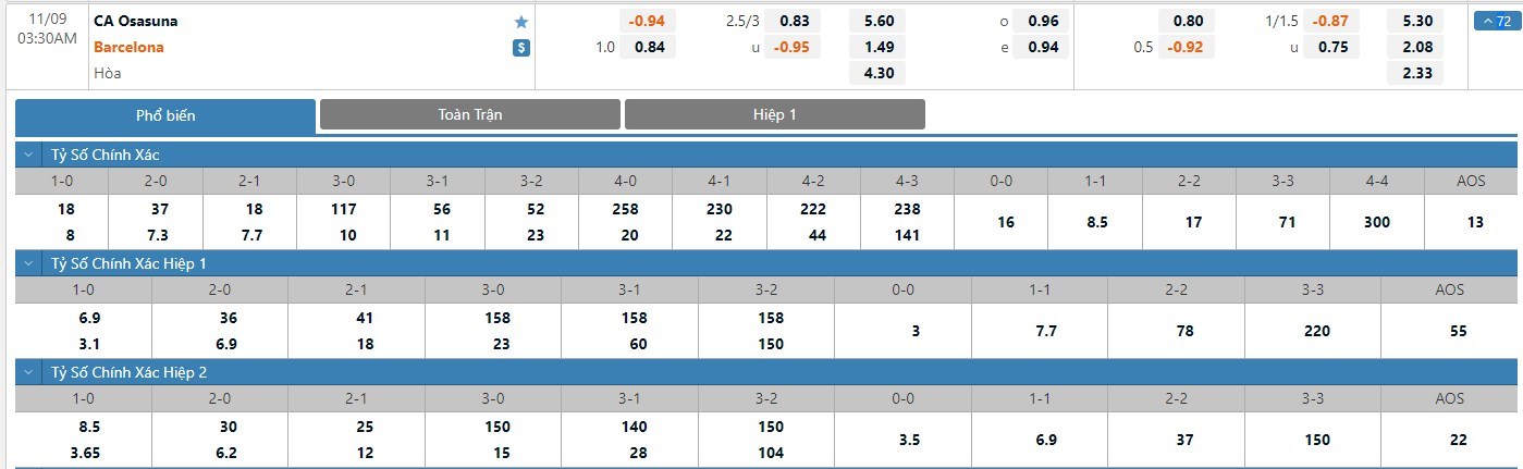 Trong 5 trận đấu gần nhất, Osasuna chỉ có 4 trận đấu mang về được cho mình ít nhất là 1 bàn thắng trong hiệp đấu đầu tiên. Còn với Barcelona, đội bóng này đã có 2 lần làm được điều này trong 45 phút đầu tiên. Với tỷ lệ kèo hiệp 1 ở trận đấu này được đưa ra là -1/2 trái thì người chơi nên tin tưởng vào đội khách trận này.