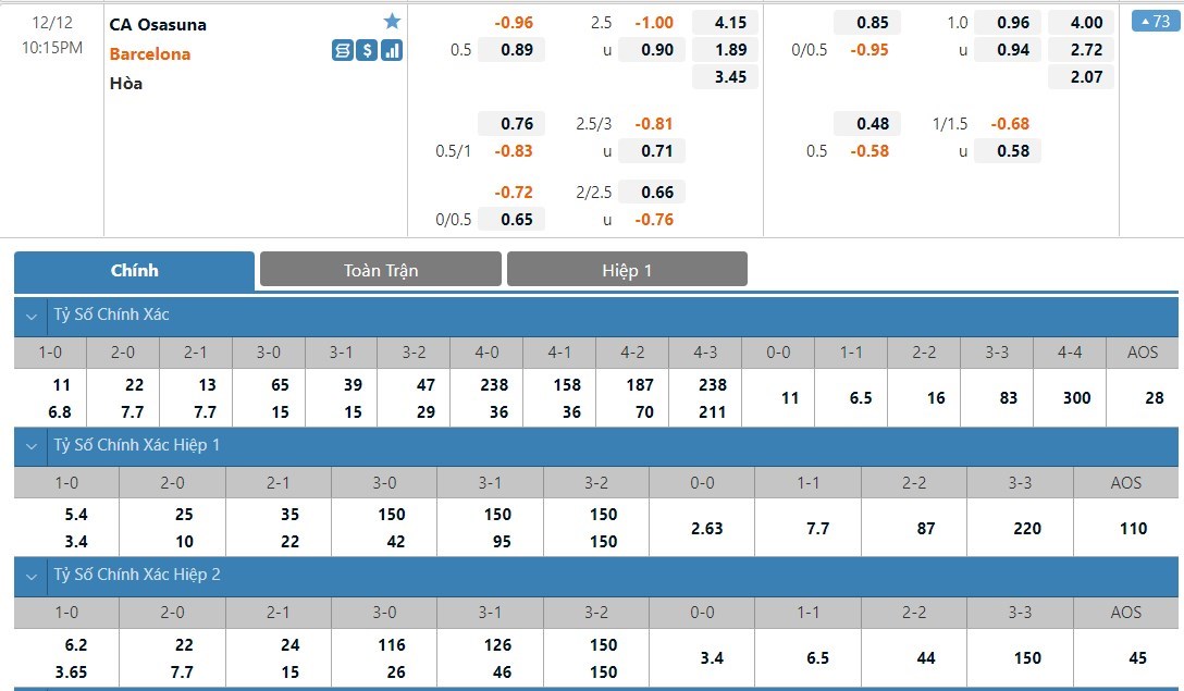 Tỷ lệ kèo cá cược bóng đá trực tuyến trận Osasuna vs Barcelona