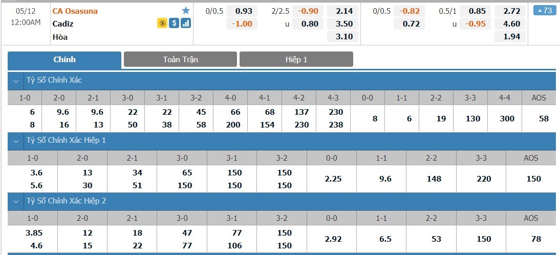 Tỷ lệ kèo cá cược bóng đá trận Osasuna vs Cadiz