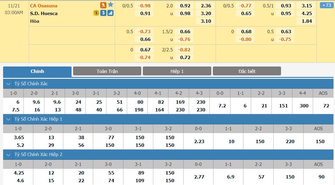 Tỷ lệ kèo cá cược bóng đá trực tuyến trận Osasuna vs Huesca