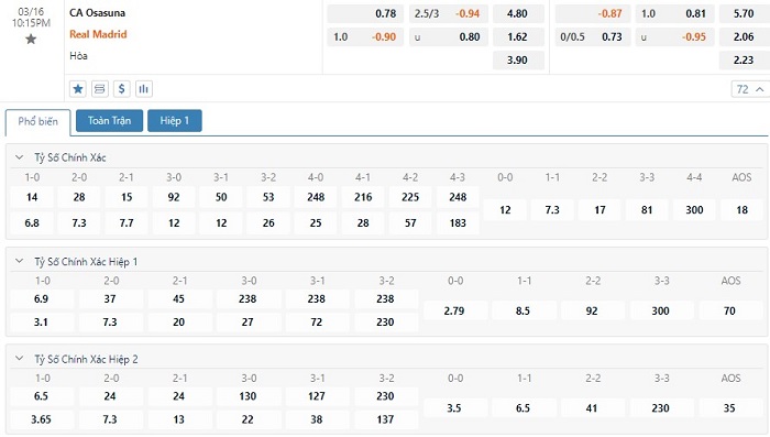 Tỷ lệ kèo cá cược bóng đá trực tuyến trận Osasuna vs Real Madrid