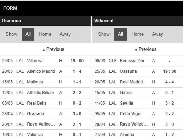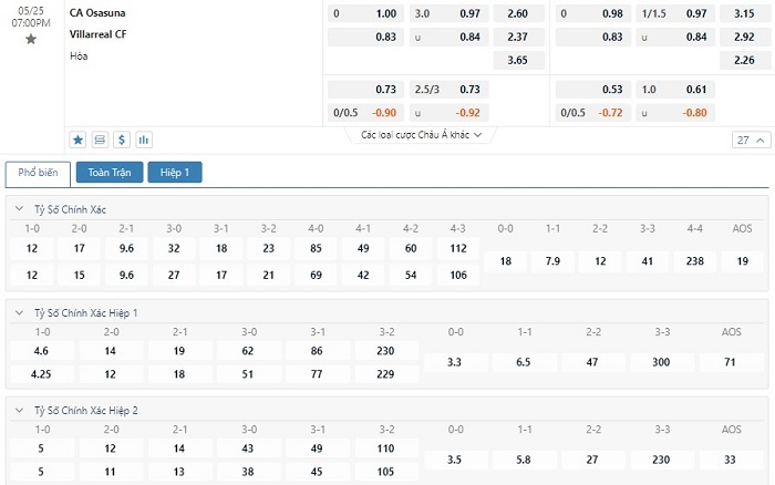 Xem tỷ lệ kèo cá cược bóng đá trực tuyến Osasuna vs Villarreal