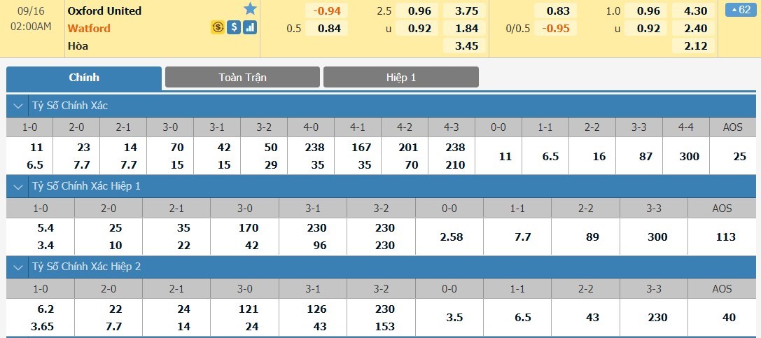 Tỷ lệ kèo cá cược bóng đá trận Oxford United vs Watford