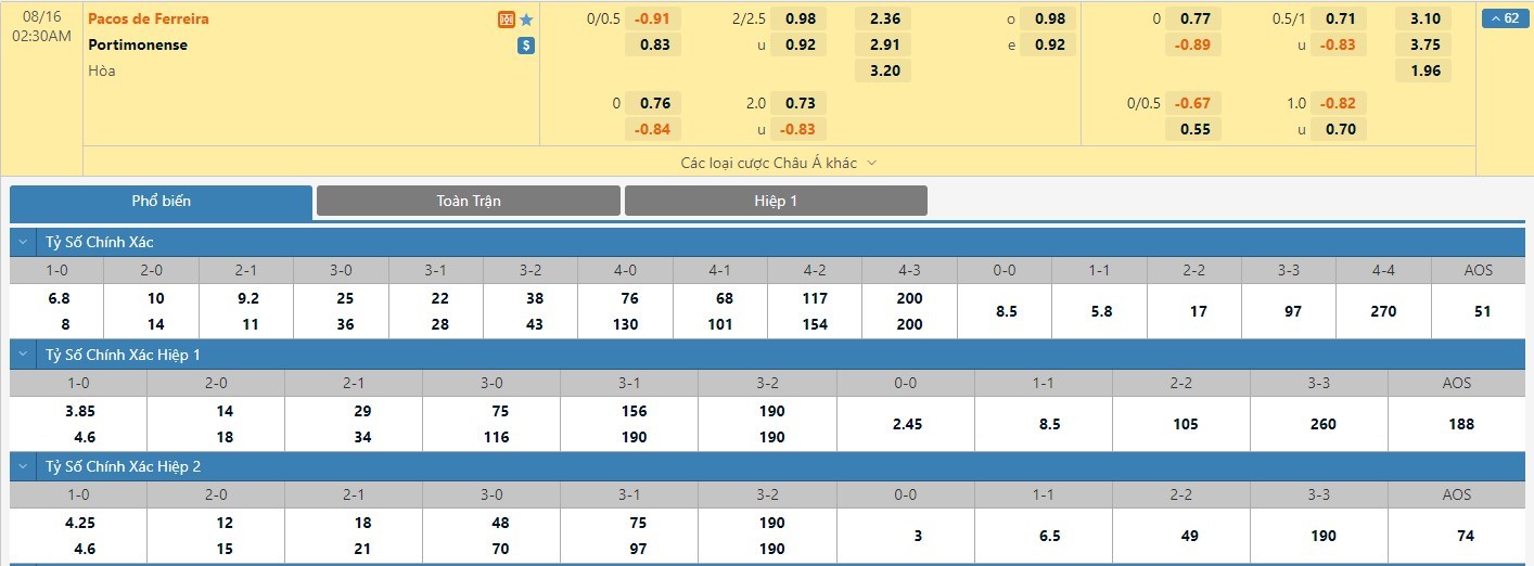 Tỷ lệ kèo cá cược bóng đá trận Pacos Ferreira vs Portimonense