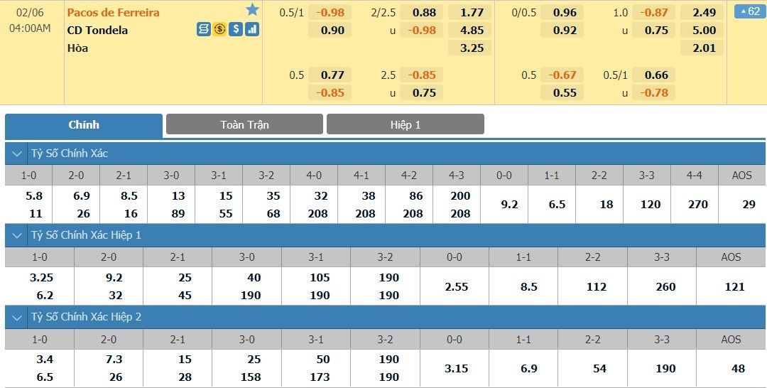 Tỷ lệ kèo cá cược bóng đá trận Pacos Ferreira vs Tondela