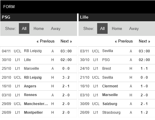 Thống kê phong độ Paris Saint-Germain vs Lille