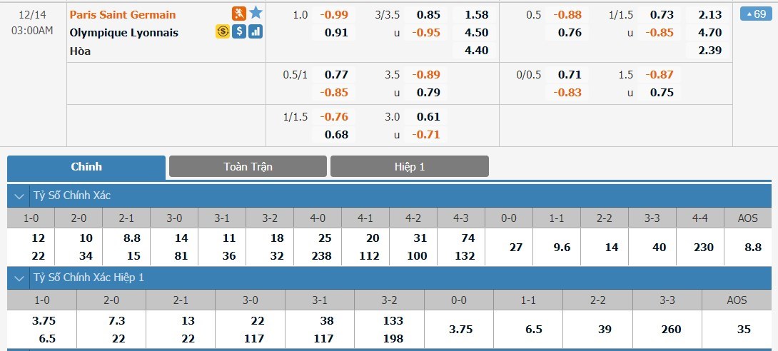 Tỷ lệ kèo cá cược bóng đá trận Paris Saint-Germain vs Lyon