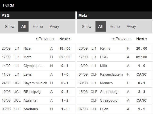 Thống kê phong độ Paris Saint-Germain vs Metz