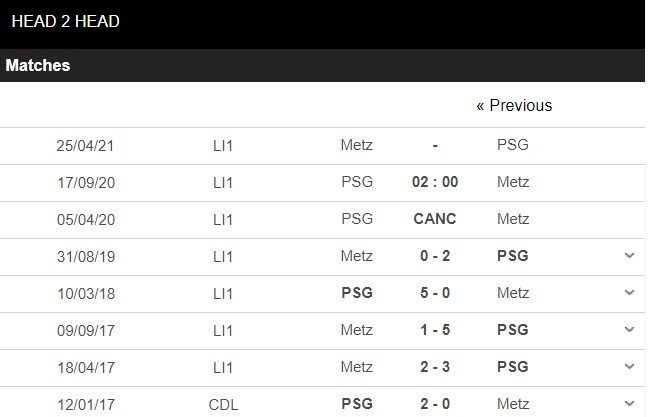 Thống kê đối đầu Paris Saint-Germain vs Metz
