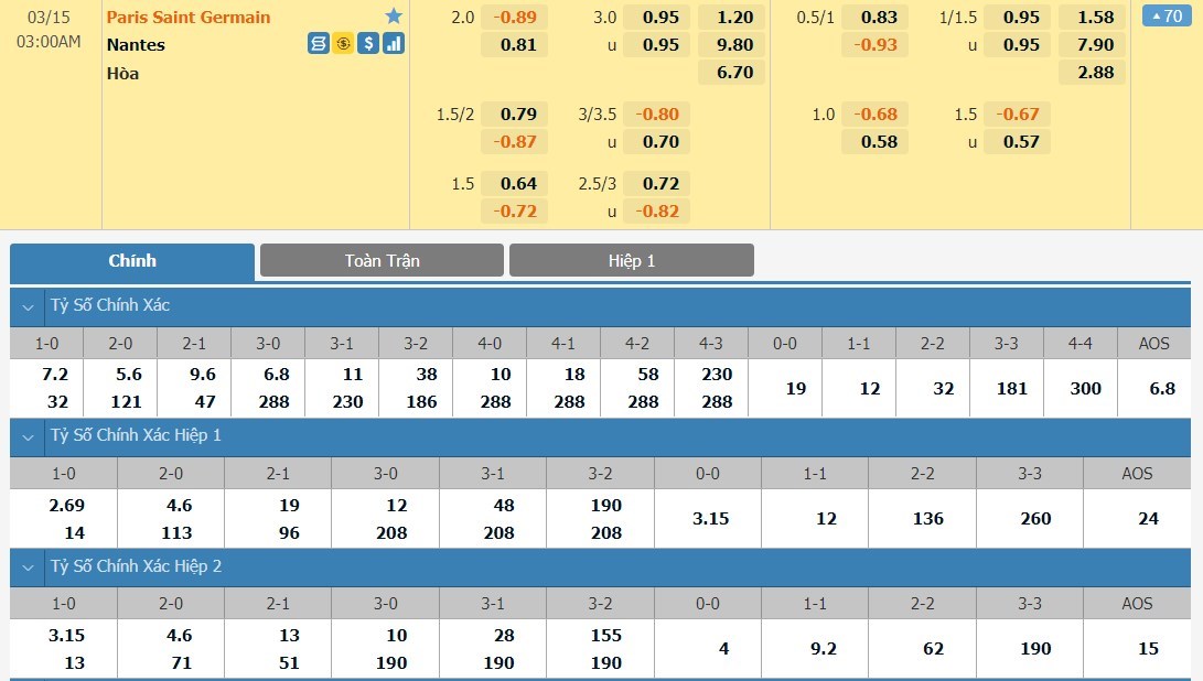 Tỷ lệ kèo cá cược bóng đá trận Paris Saint-Germain vs Nantes
