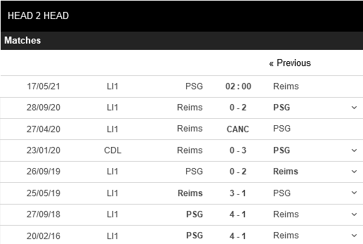 Thống kê đối đầu Paris Saint-Germain vs Reims
