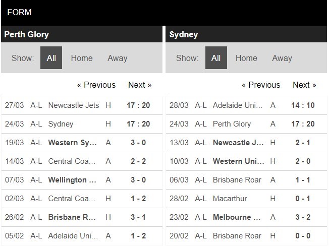 Thống kê phong độ Perth Glory vs Sydney FC