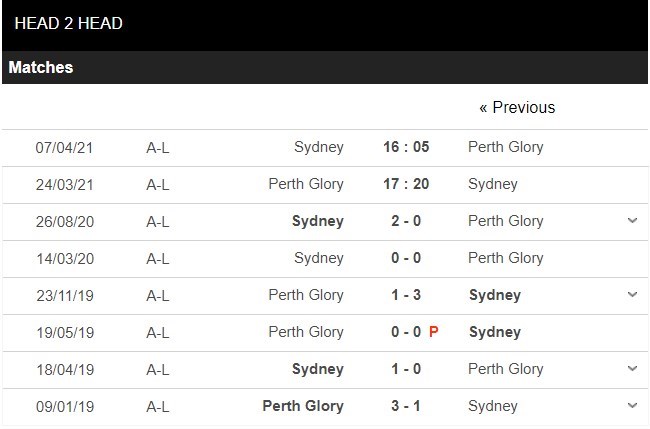 Thống kê đối đầu Perth Glory vs Sydney FC