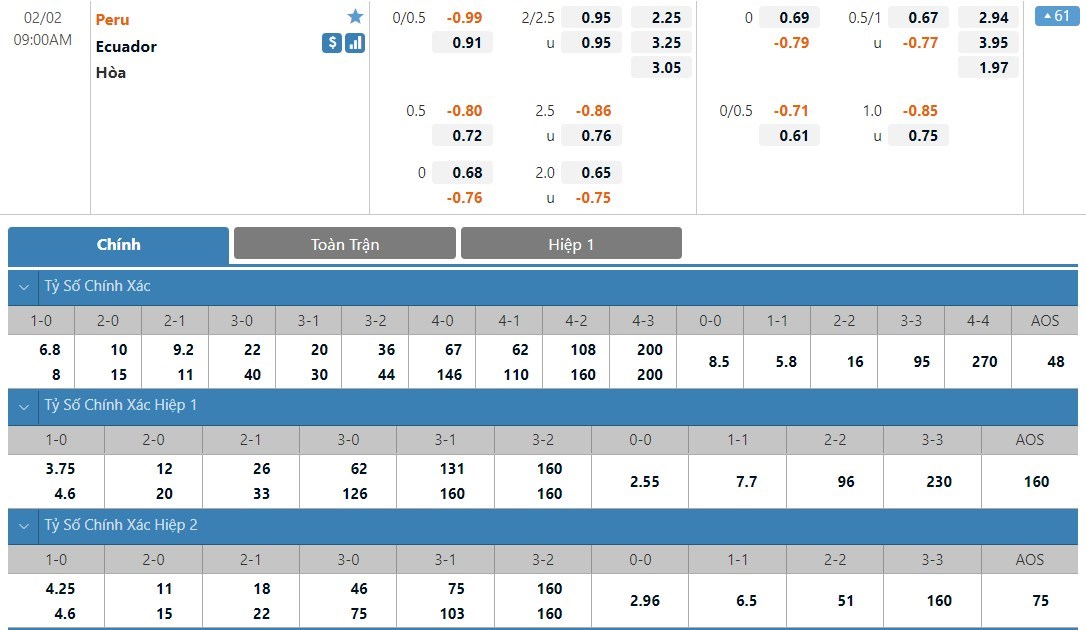 Tỷ lệ kèo cá cược bóng đá trực tuyến trận Peru vs Ecuador
