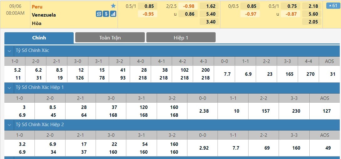 Tỷ lệ kèo cá cược bóng đá trận Peru vs Venezuela