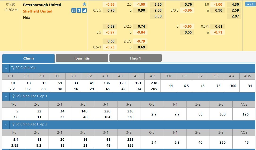 Tỷ lệ kèo cá cược bóng đá trực tuyến trận Peterborough vs Sheffield United