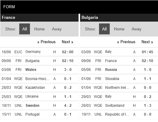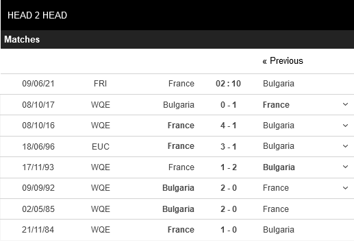 Bulgaria đã đánh bại Pháp 3 lần giữa các năm 1985 đến 1993. Nhưng Les Bleus kể từ đó đã giành 3 chiến thắng liên tiếp trước Bulgaria. Với sức mạnh hiện tại, một chiến thắng đậm dành cho đội tuyển Pháp là điều không cần phải bàn cãi.