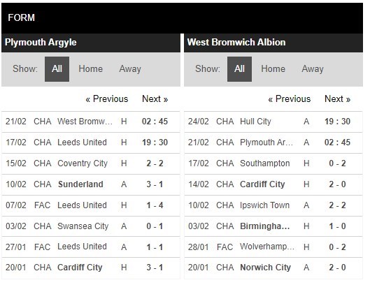 Thống kê phong độ Plymouth vs West Brom