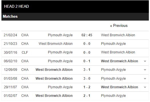 Thống kê đối đầu Plymouth vs West Brom