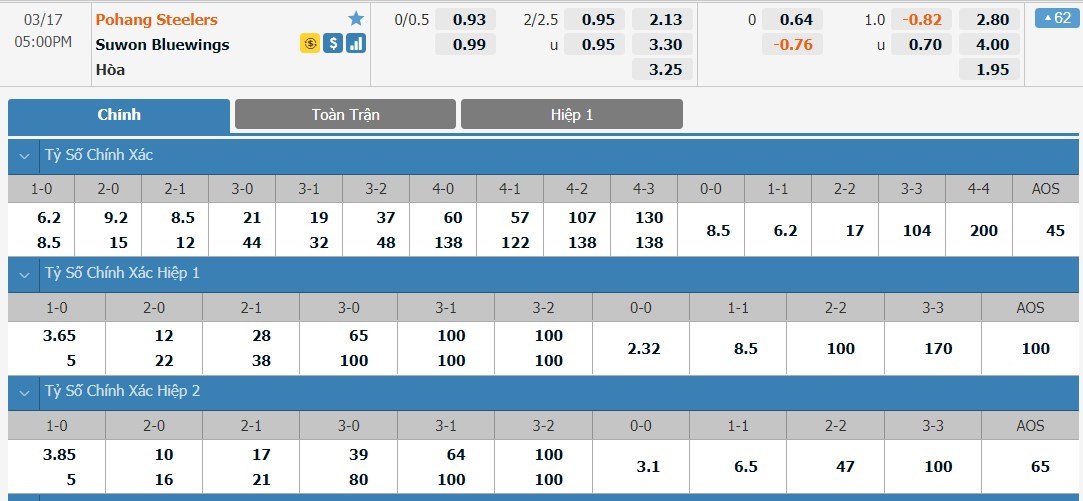 Tỷ lệ kèo cá cược bóng đá trận Pohang Steelers vs Suwon Bluewings