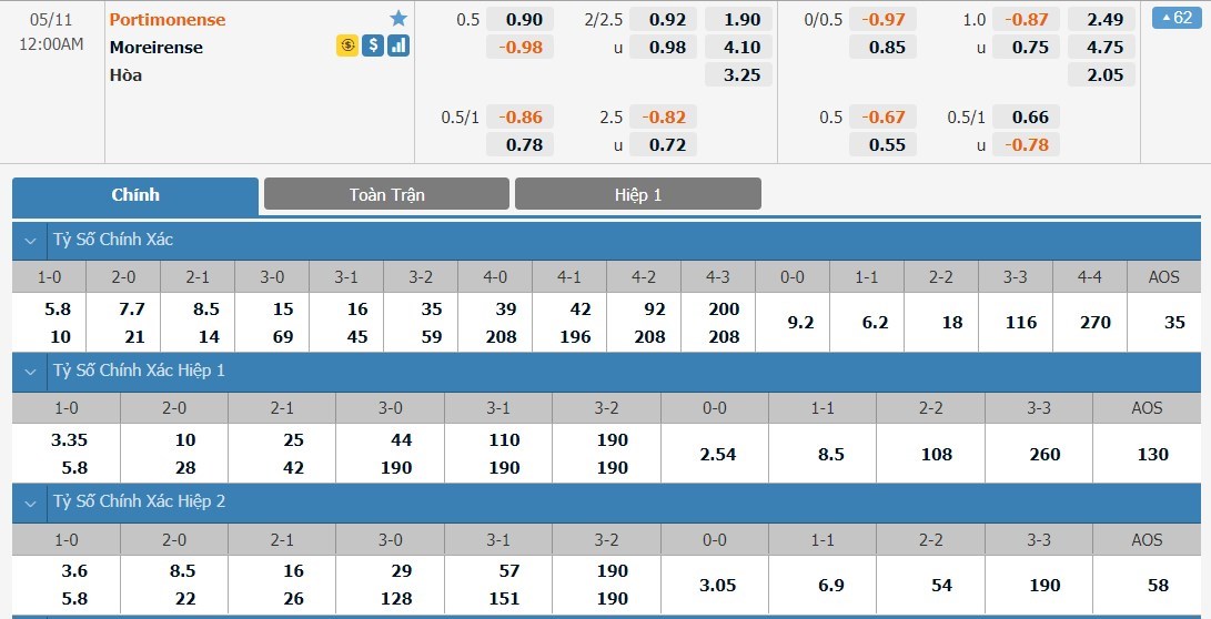 Tỷ lệ kèo cá cược bóng đá trực tuyến trận Portimonense vs Moreirense