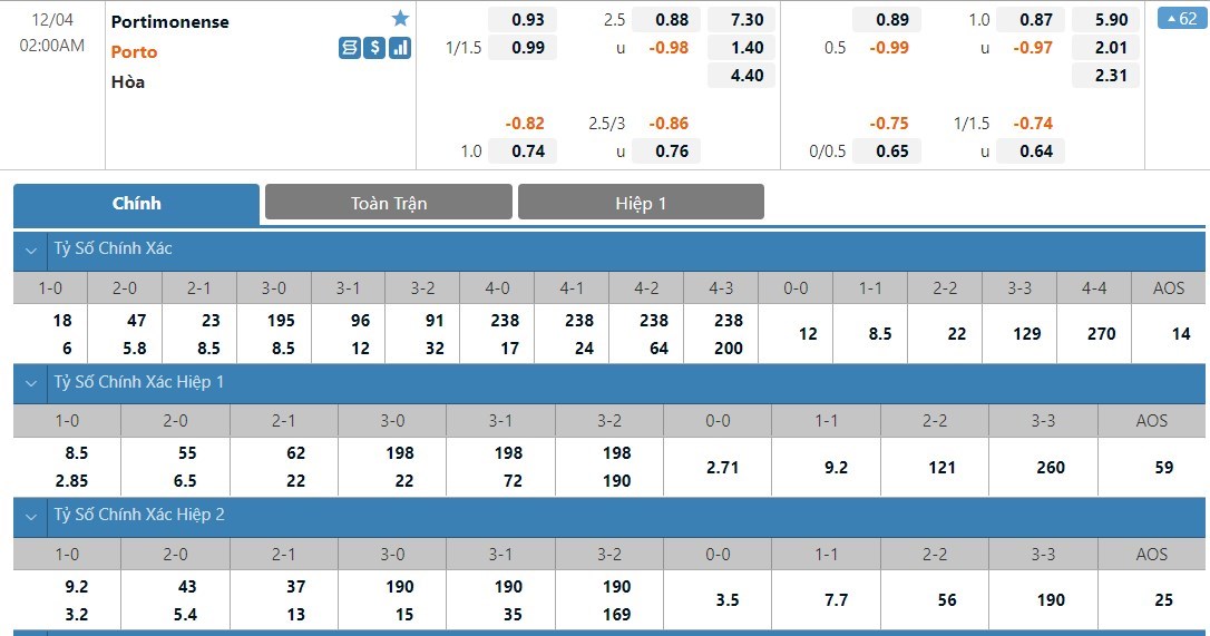 Tỷ lệ kèo cá cược bóng đá trận Portimonense vs Porto